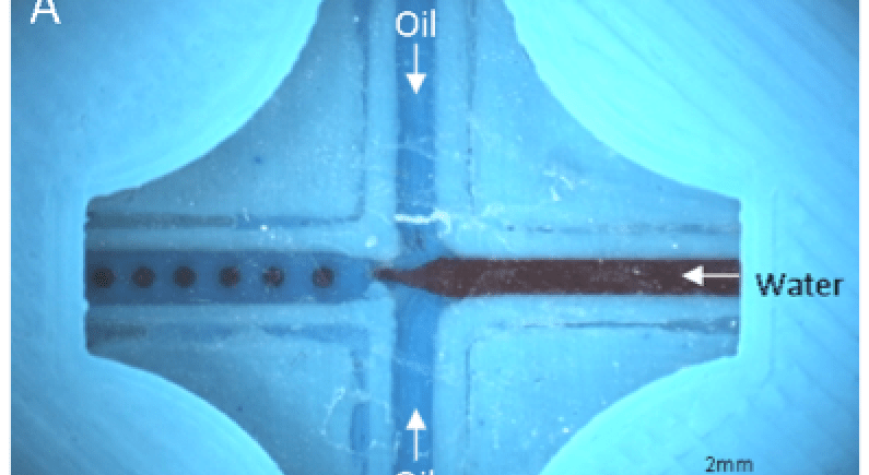 Droplet microfluidics makes use of the difference in fluid behaviour on the small scale, where surface and viscous forces dominate. Many small droplets of water in oil can be produced at a rapid rate with great regularity. Microdroplets are useful for miniaturisation of chemical reaction and rapid, high-throughput experimentation.